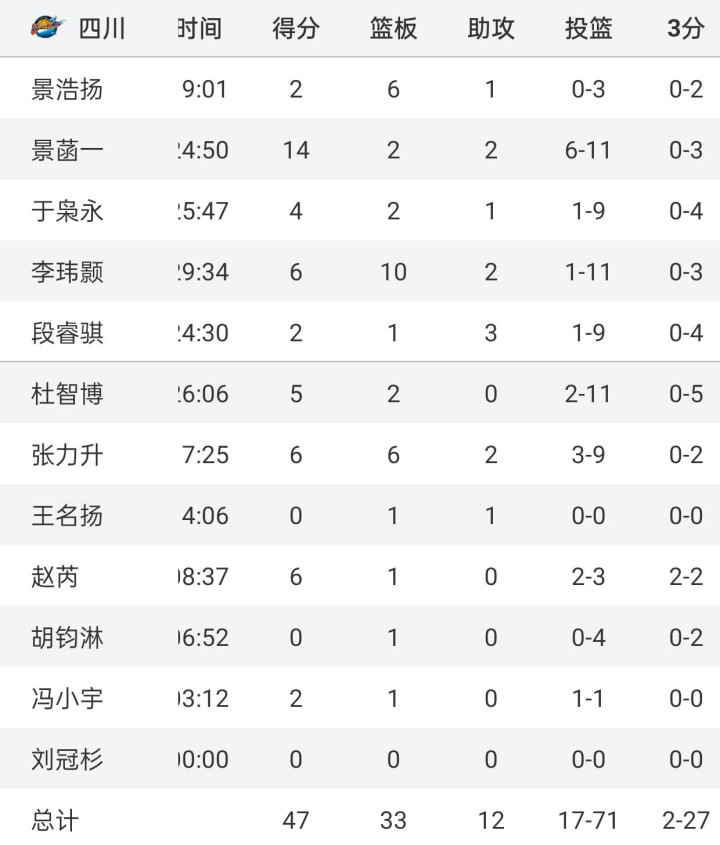 这场比赛,四川男篮真是刷新了职业球队的下限,全队12人,有11人上场,结果就景菡一1人得分上双,其他人的命中率完全可以用惨不忍睹来形容,下面是本场比赛四川队的赛后数据:全场投篮71次,但是只命中17球,命中率仅为23.9%,其中球队三大首发于枭永投篮9中1,李玮颢投篮11中1,段睿骐9中1,三大主力合计29中3,命中率刚过10%。此外,四川这场全队三分27中2,命中率仅为7.4%,要知道,很多都是空位三分,结果就投出这样的命中率,着实有些离谱。