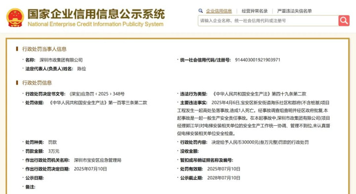 近日,深圳市宝安区应急管理局公布一则行政处罚决定,对深圳市政集团有限公司(以下简称“深圳市政集团”)处以人民币3万元罚款,起因是该集团未能有效履行统一协调管理职责,导致其承建项目发生高处坠落事故,造成1名工人死亡。